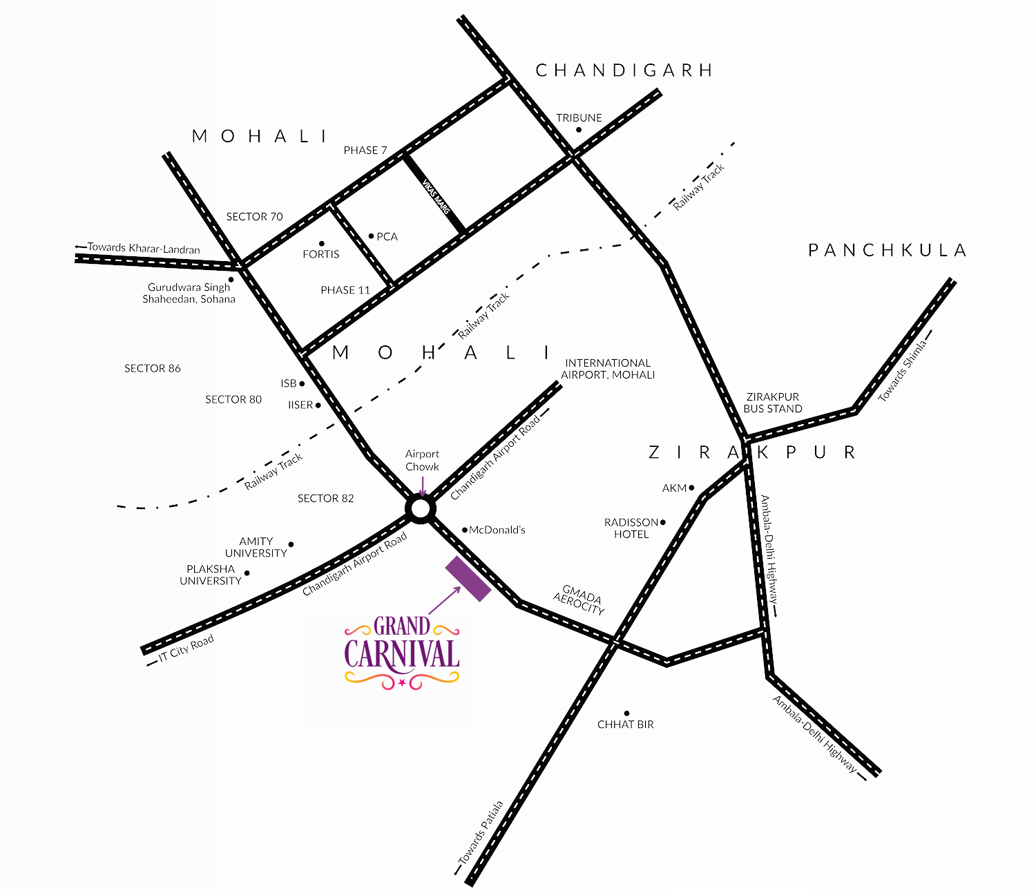 Favourably surrounded by a dense network of residential sectors comprising of an affluent population on Mohali’s Airport Road, RGI Grand Carnival is poised to succeed with its strategic location just ahead of the vibrant aerocity. The expansive frontage of 800 Ft. (approx.) that runs along the length of the Airport Road in Mohali also provides RGI Grand Carnival with a commanding presence that will help attract visitors, walk-ins, shoppers, and investors alike